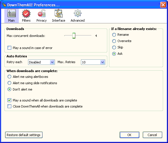 - You can configure the preferences. Go to Tools –> DownThemAll! Tools –> Preferences. You can configure and adjust many feature here.