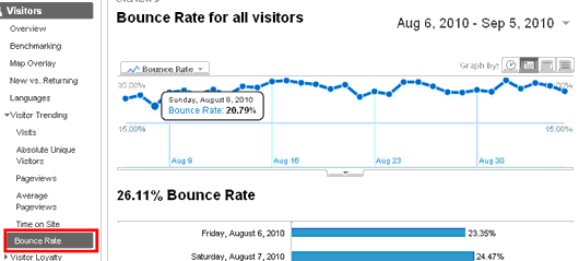 Google Analytics provides Bounce Rate in the Dashboard under the “Visitor Trending” section. See the Bounce Rate of one of the Globinch blog. The average bounce rate is below 30% .