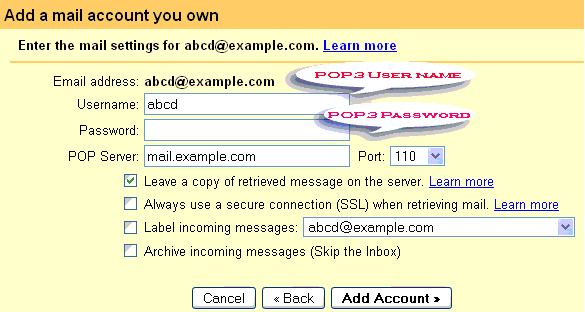 You can configure few options here. You can leave a copy of the message in the mail server as well as you can label the incoming messages. This will organize the mails from this mail account under unique label.You can also archive incoming messages so that it will skip the Inbox and can be directly accessed from the specified label in the GMail menu section. See the screen shot below.