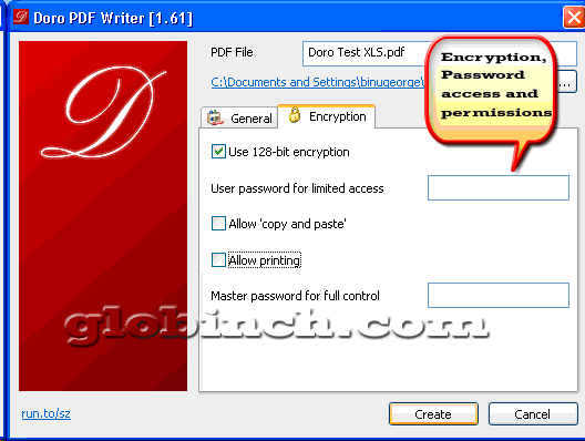 - In the next screen you can setup the details of the file. Also one important feature of this tool is that you can encrypt the PDF with 128-bit password protection. Apart from this, you can prevent ‘copy and paste‘ and printing of the generated PDF document. See below.