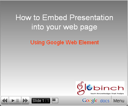 - Google Element will present you the code that you paste in your web page where you want the presentation to appear. It will appear as below.