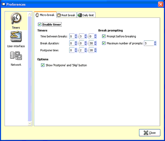 The screen will will block you from using the computer for the specified amount of time. The alert message will remind you of the upcoming break. The tool allows you to configure micro break, Rest break and Daily limit. See below
