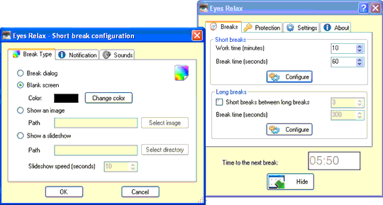 Eyes Relax is a utility that helps avoiding eyes-related problems when working at a computer for several hours. The cool feature of this tool is the password-protected Parent Mode. You can set a password and change the Break type to blank screen. In Parent mode the user is forced to take breaks since during the break the computer is locked. See below.